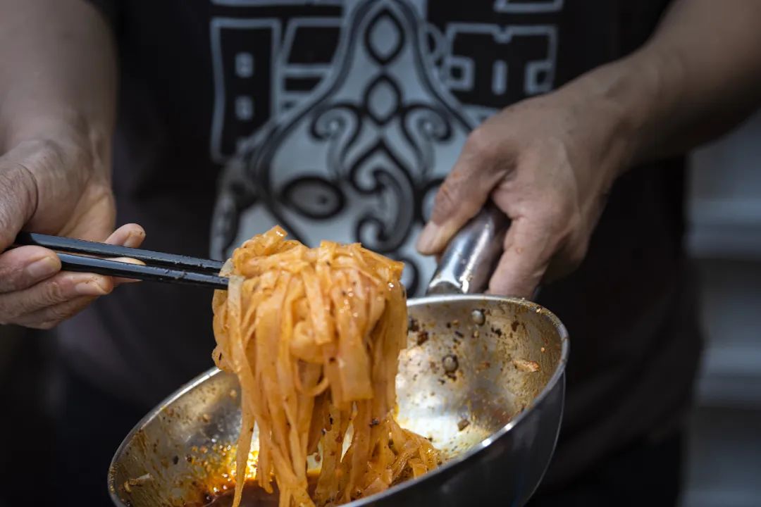 顾客在一家岐山臊子面餐馆内品尝臊子面。