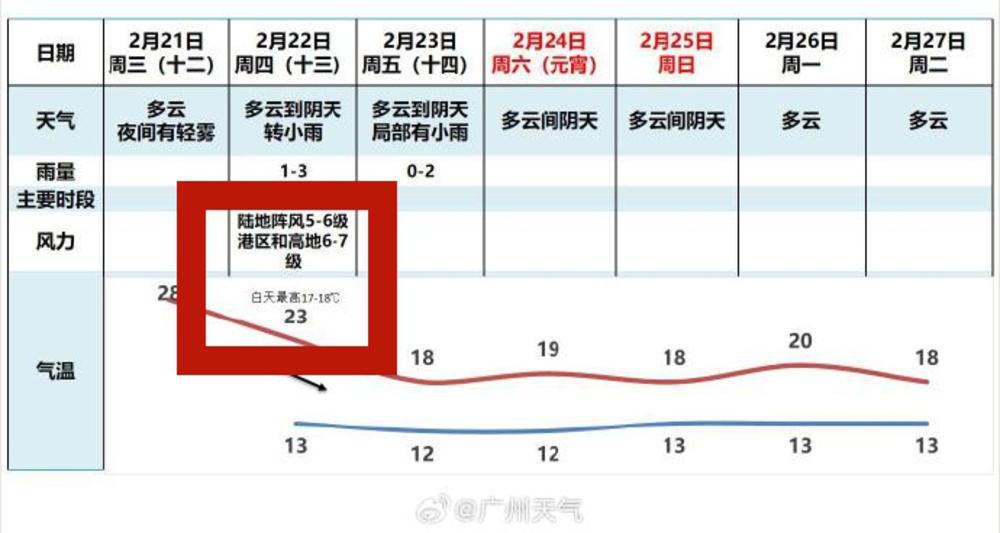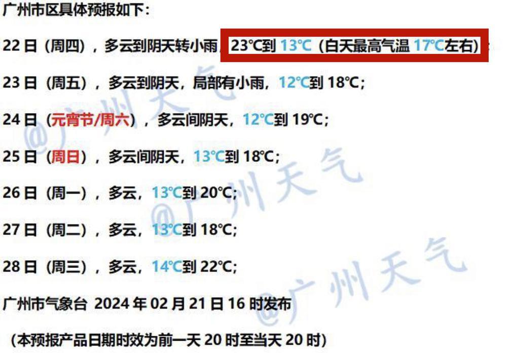 留意广州市气象台天气预报的市民和网友,会注意到该台近期多天有关2月22日的最低及最高气温预报旁,用括号标注“白天最高气温”。在21日傍晚的市区七天预报中,在22日预计最高气温21℃及最低气温13℃旁特别标注“白天最高气温17℃左右”;21日上午的会商预报结论,则特别标注22日“白天最高气温17~18℃”。