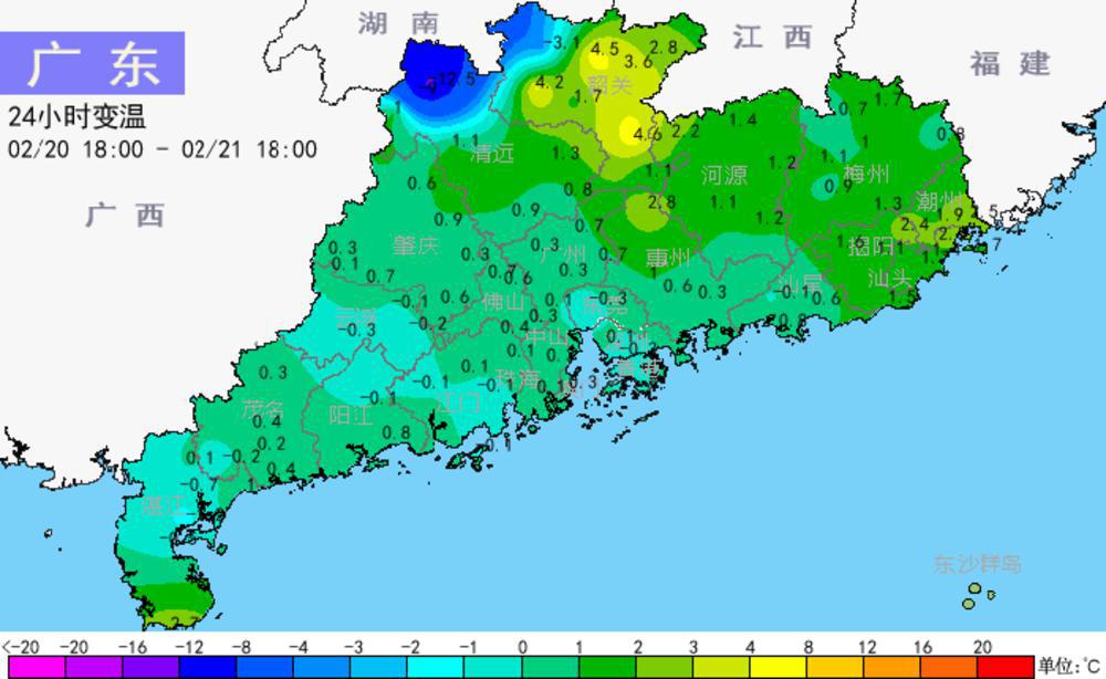 根据广州市气象部门观测,截至2月21日16时,广州国家基本气象站录得当天最高气温28.7℃,各区代表站最高气温28~30℃。在广州享受“初夏温”的同时,强冷空气前锋已侵入粤北。广东省气象部门观测,21日17时连州14.1℃,同比20日下降10.9℃;连南16.4℃,同比20日下降6.8℃;乐昌19.8℃,同比20日下降0.9℃。