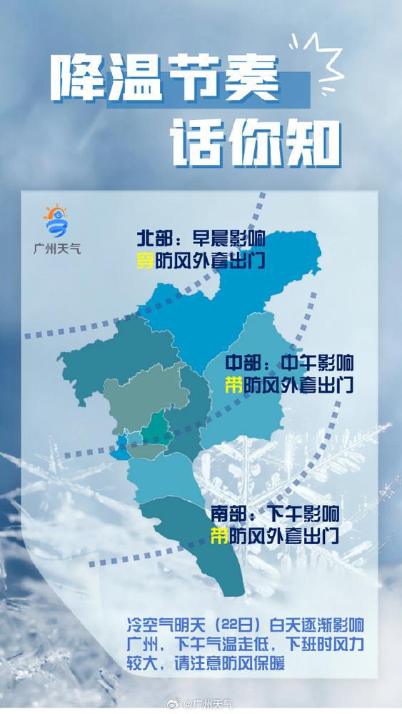 按照现有强冷空气前锋移动情况,广州市气象部门预计22日早晨强冷空气开始影响广州北部,中午前后影响广州中部城区,受其影响,21日白天广州多云到阴天转小雨,气温将持续下降,日平均气温下降7~10℃,21日夜间广州市区最低气温降至13℃左右。按照上述预报结论,广州北部地区居民22日早晨出门时应已感受到风力加强气温下降,中部城区居民则在中午前后同样感受到风力加强气温下降,入夜后广州各地居民将感到气温下降更明显。