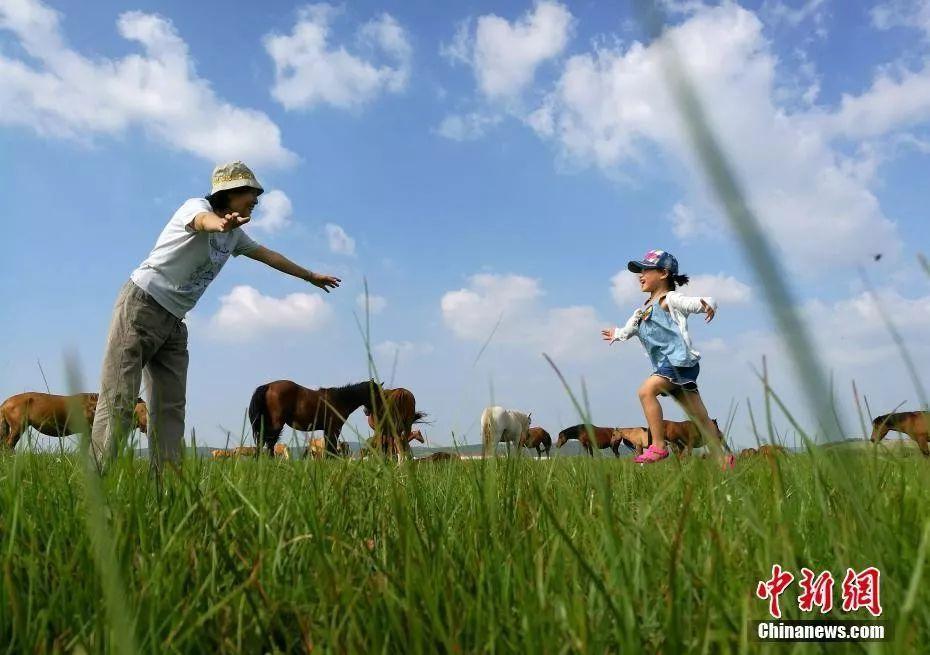祖孙俩在塞罕坝机械林场内玩耍。杨可佳 摄