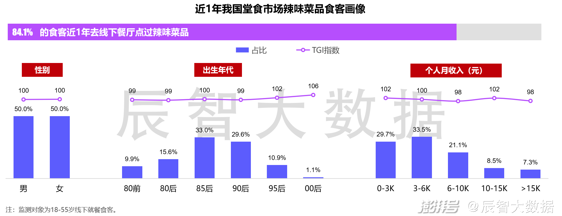 近1年辰智针对近1.5万消费者的线下就餐跟踪发现,约84.1%的消费者线下堂食时点选了辣味菜品。根据对吃辣人群性别、年龄与收入的分析及与整体监测人群比较算出的TGI指数来看,我国吃辣人群男女各半,95后与00后人群的占比相比整体监测人群高,年轻人成为辣味菜品的消费主力。