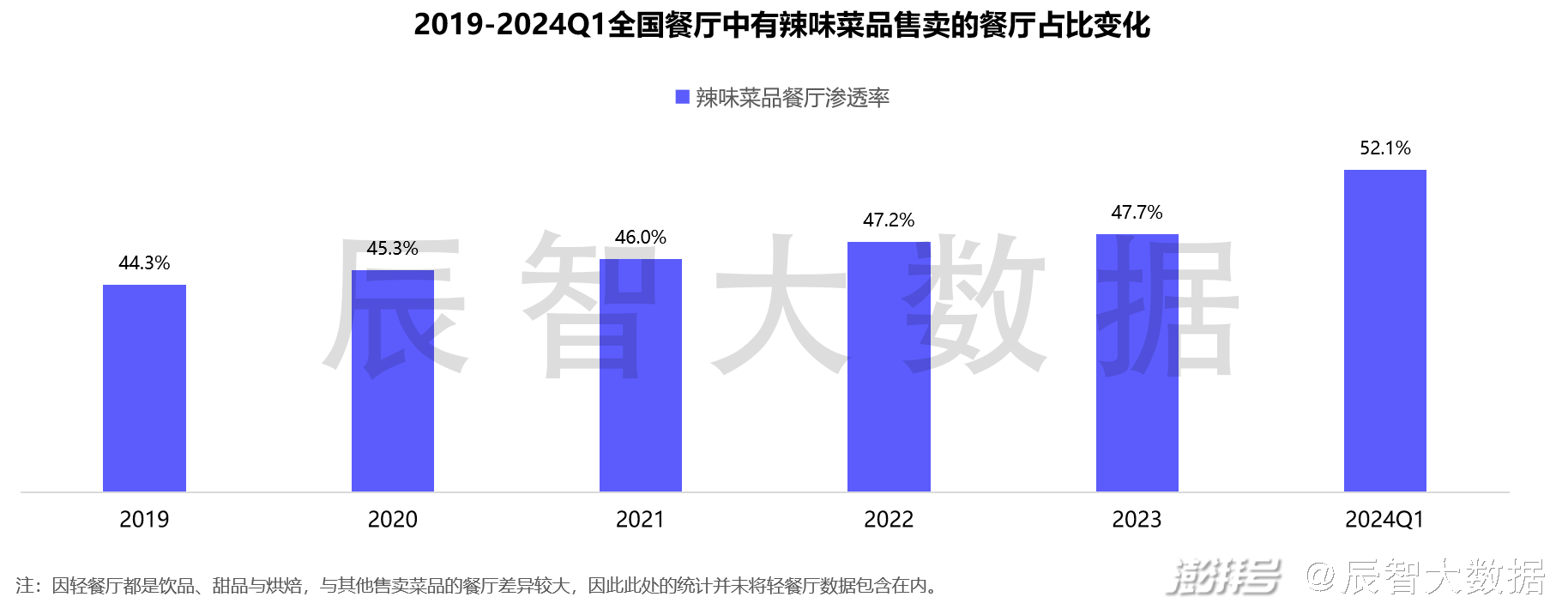 辰智大数据显示,截至2024Q1,52.1%餐厅在辣味菜品售。近几年,辣味菜品餐厅渗透率变化呈现逐年升高态势,不少口味以清淡著称的粤菜和江浙菜馆,也会将酸菜鱼、小炒肉等经典辣味菜品列入菜单。