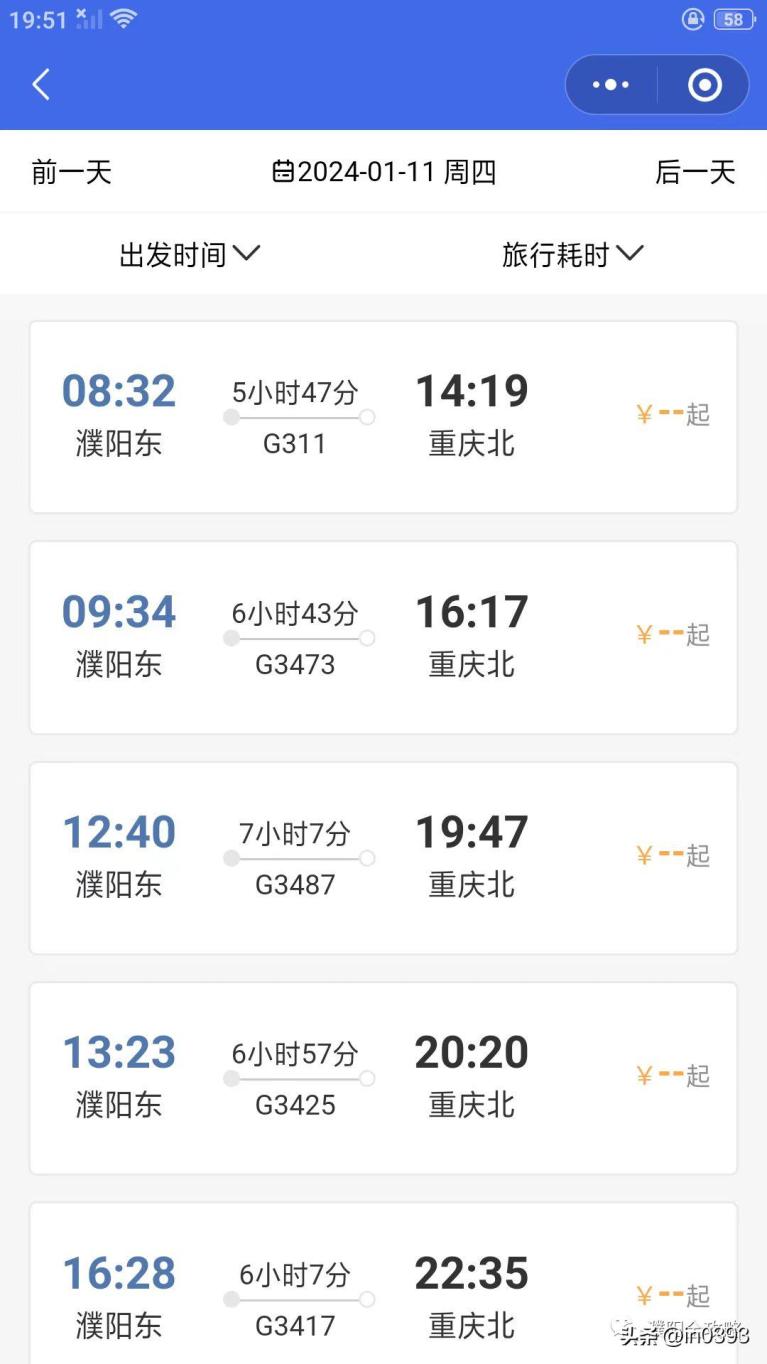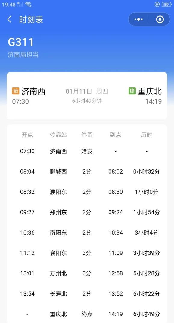 济南西-重庆北G311,濮阳可直达襄阳东、万州北、重庆北等地。
