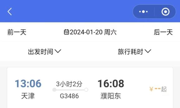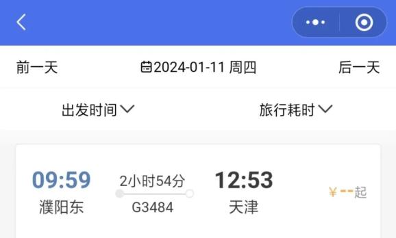 郑州东-沈阳北G3484,濮阳直达天津2小时54分钟,天津至濮阳3小时2分。
