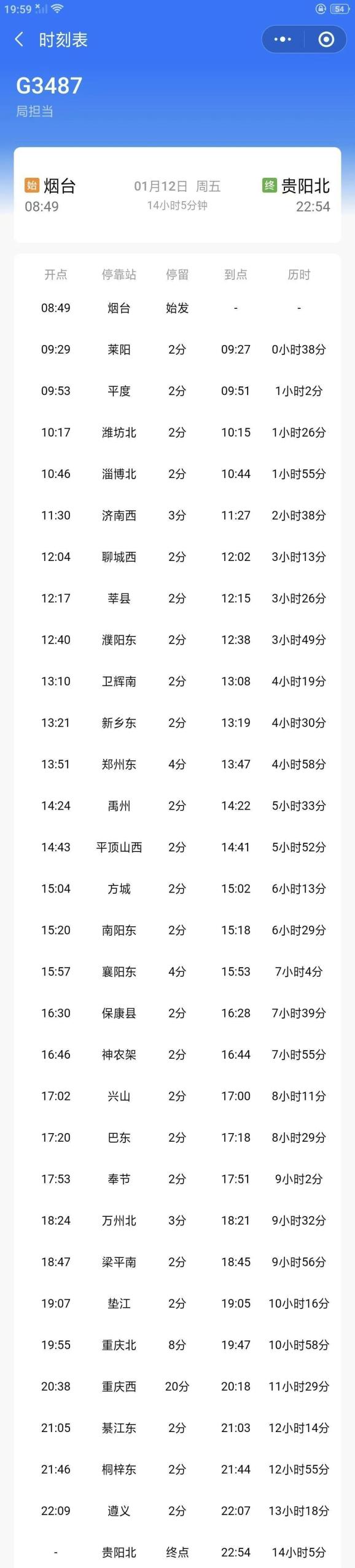 烟台-贵阳北G3487,濮阳可直达襄阳、重庆、遵义、贵阳等城市。