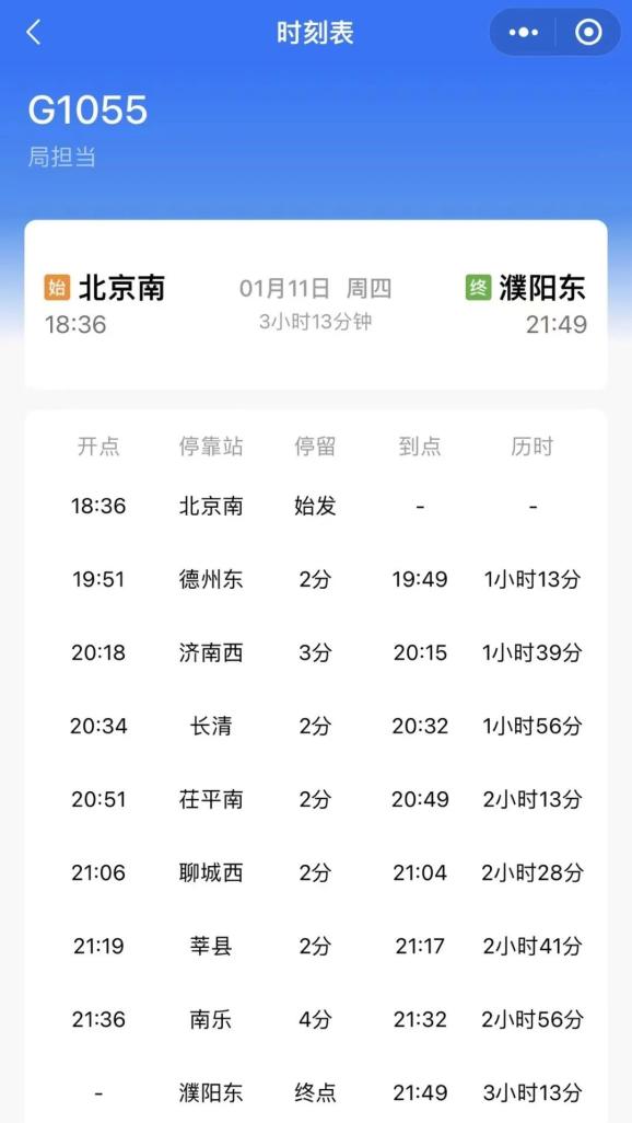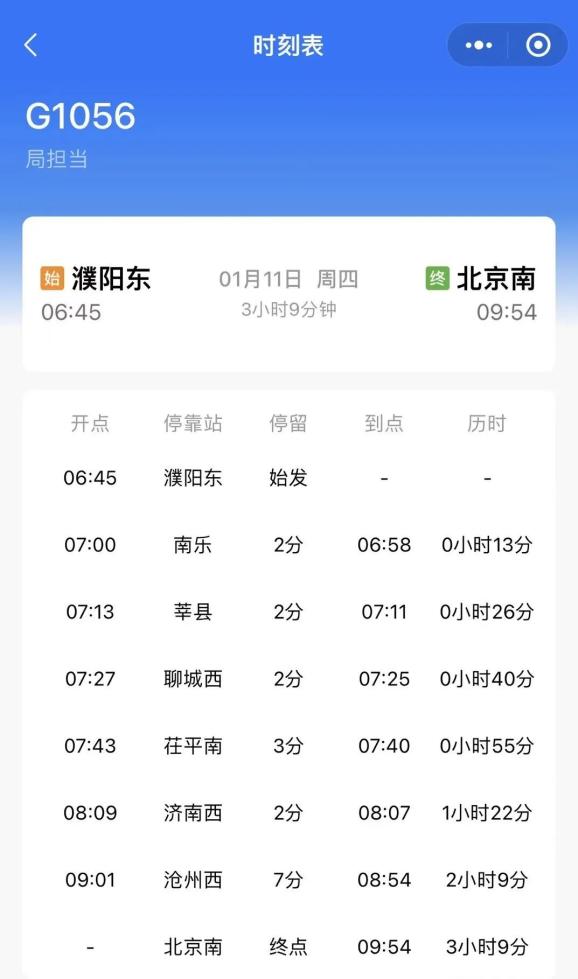 1月10日调图后,每天都有一班列车往返濮阳东和北京南,从濮阳东到北京南车次G1056历时3小时9分钟(6:45—9:54),从北京南到濮阳东车次G1055历时3小时13分钟(18:36—21:49)。