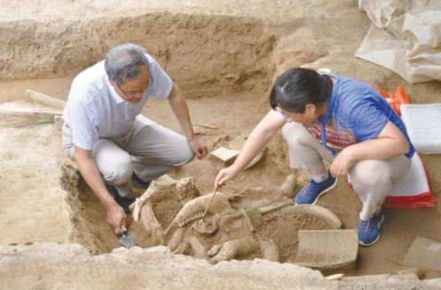 岳连建研究员(左)与古动物专家在清理祭祀坑动物骨。本版照片均由受访者提供