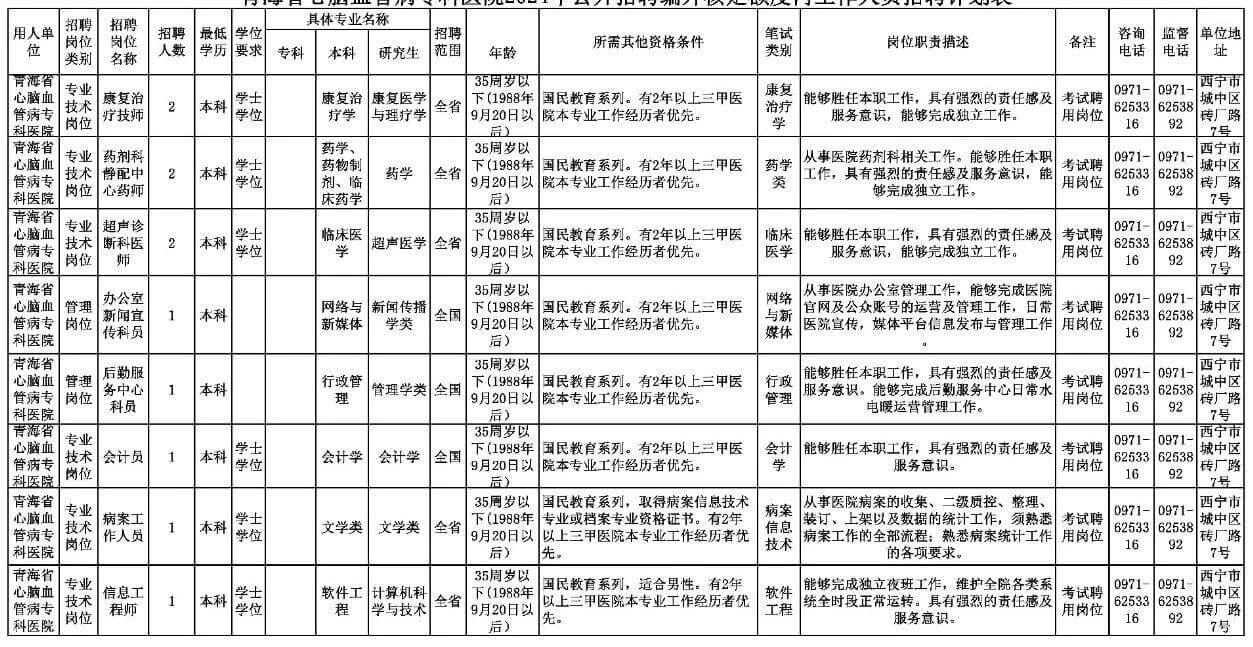 附件:青海省心脑血管病专科医院2024年公开招聘编外核定额度内工作人员招聘计划表