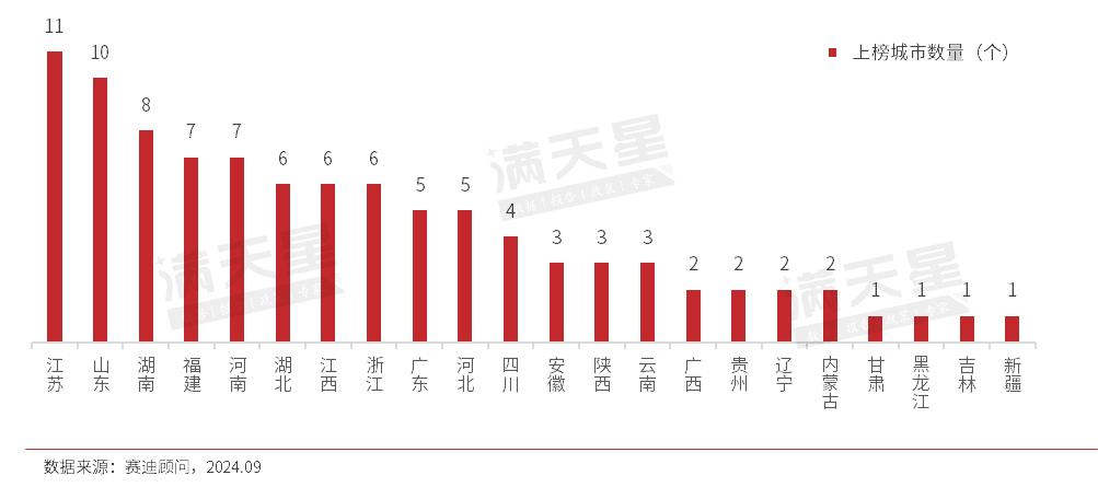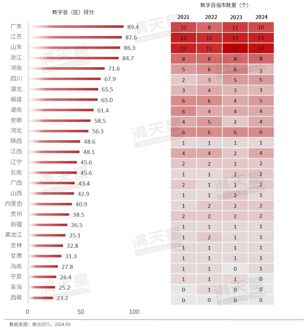 从省级行政区域分布看,山东、江苏和广东数字城市竞争力依然大幅领先,三省入围百强市数量占全国百强市数量的37%,自2021年以来持续领跑数字城市百强,并且三省2024数字省(区)得分位居前三,综合实力凸显。