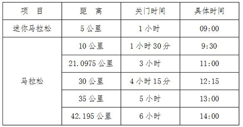 为了保证参赛选手比赛安全、顺利,比赛期间比赛路线各段设关门时间,限时对社会交通封闭。关门时间后,相应路段恢复社会交通。参赛选手在规定的关门时间内,未跑完对应的距离请立即停止比赛,退出赛道,以免发生危险。退出比赛的选手可乘坐组委会(马拉松项目竞委会)提供的援救车到相应项目的终点处。