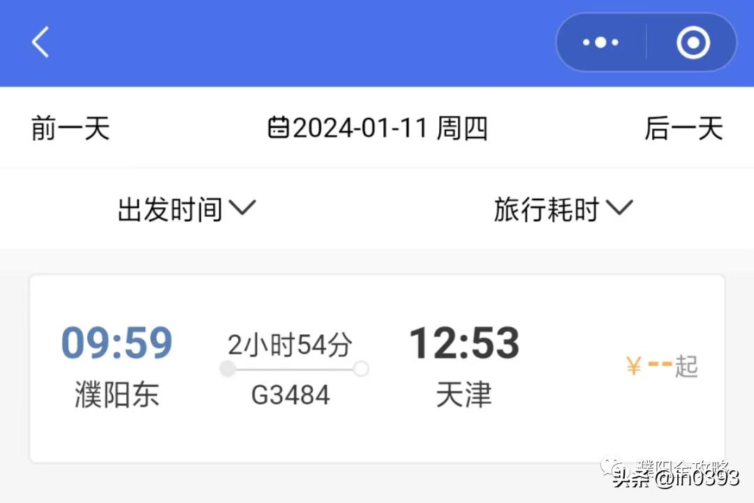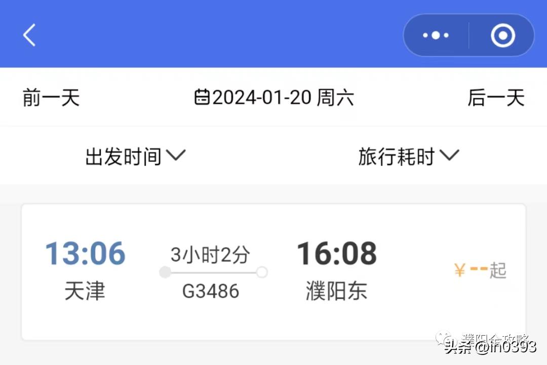 郑州东-沈阳北G3484,濮阳直达天津2小时54分钟,天津至濮阳3小时2分。