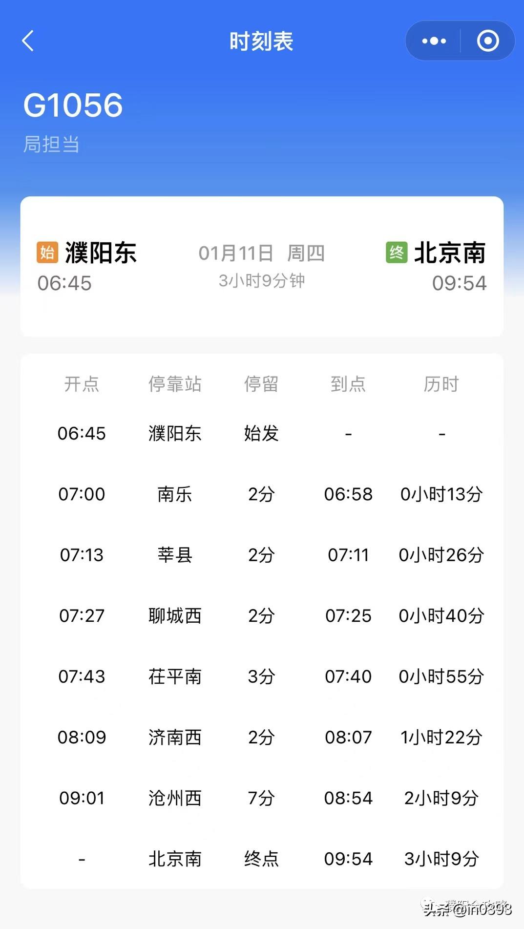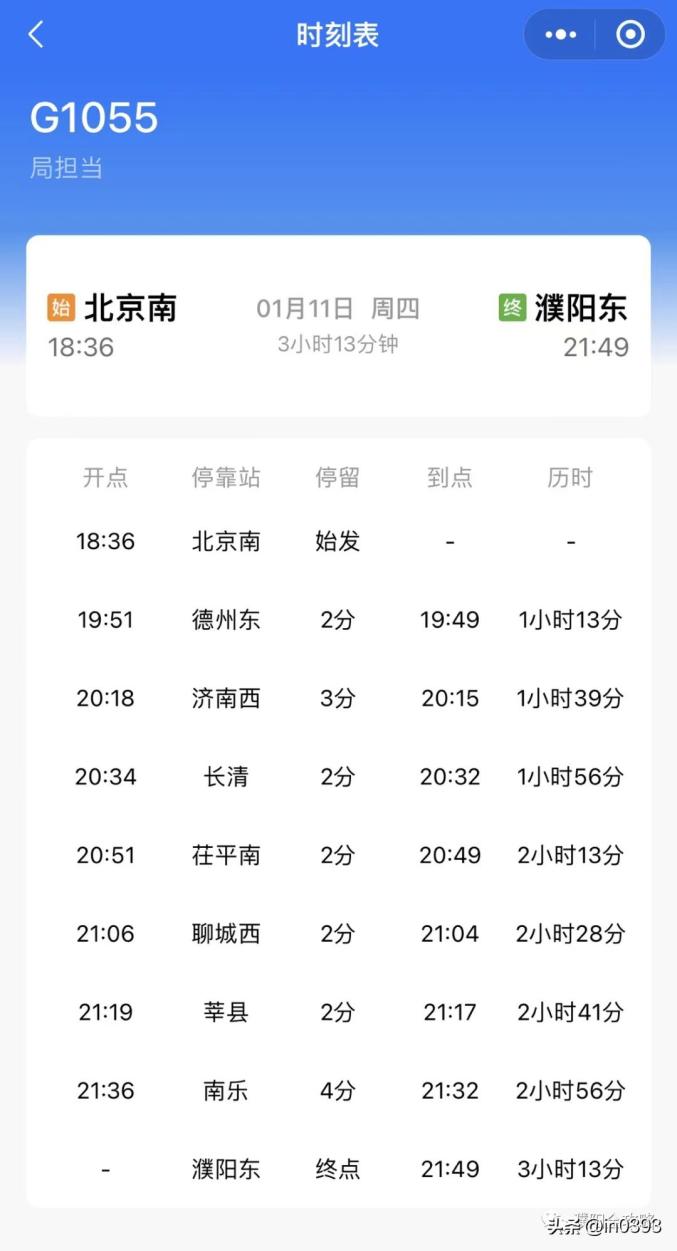 1月10日调图后,每天都有一班列车往返濮阳东和北京南,从濮阳东到北京南车次G1056历时3小时9分钟(6:45~9:54),从北京南到濮阳东车次G1055历时3小时13分钟(18:36~21:49)。