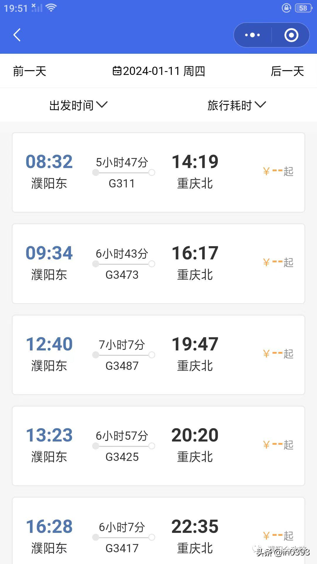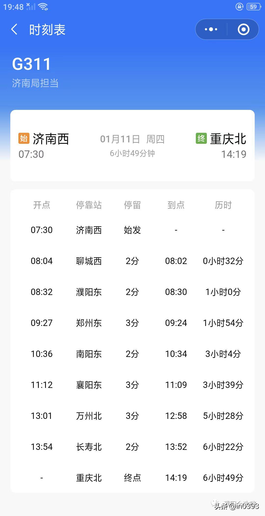 济南西-重庆北G311,濮阳可直达襄阳东、万州北、重庆北等地