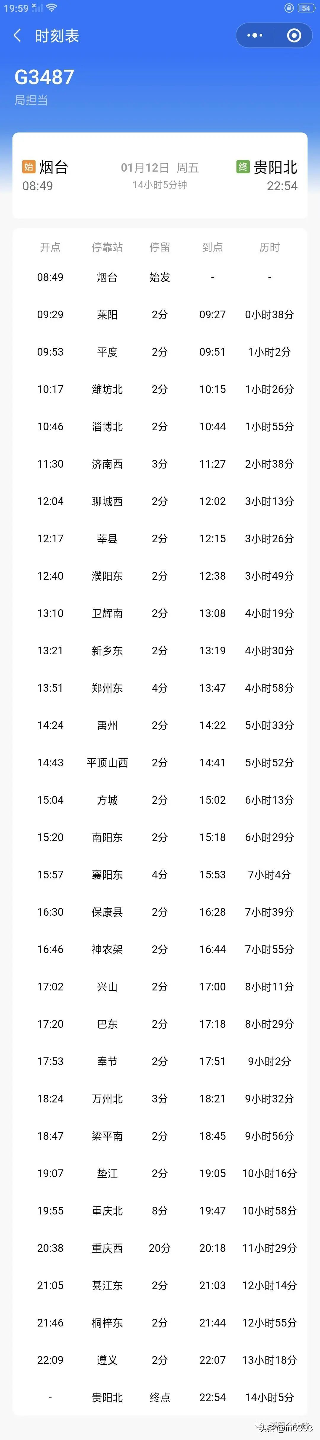 烟台-贵阳北G3487,濮阳可直达襄阳、重庆、遵义、贵阳等城市