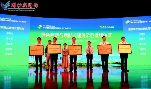 ▲2018年9月21日,在2018山东省第四届绿色建筑与建筑节能新技术产品博览会上,我市被授予国家级绿色建筑与装配式建筑示范城市。图为授牌仪式现场。                         路振宇摄