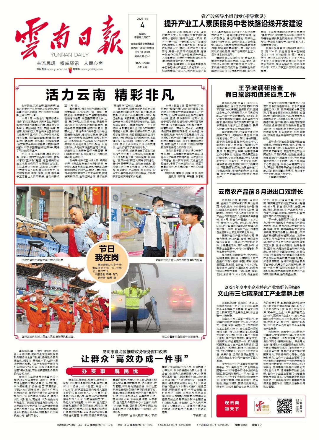 《云南日报》2024年10月4日头版头条刊发稿件《活力云南 精彩非凡》。稿件指出,昭通市威信县在国庆期间,推出了红色文化旅游节文艺演出、山地自行车越野赛、少儿红色歌曲大赛、“寻味垕房”民俗体验、“扎西味道”厨艺大赛等系列活动,游人如织,唱红色歌曲、赏摄影展、看露天电影、品特色美食等为游客带来别样的体验,红色文化旅游再掀热潮。
