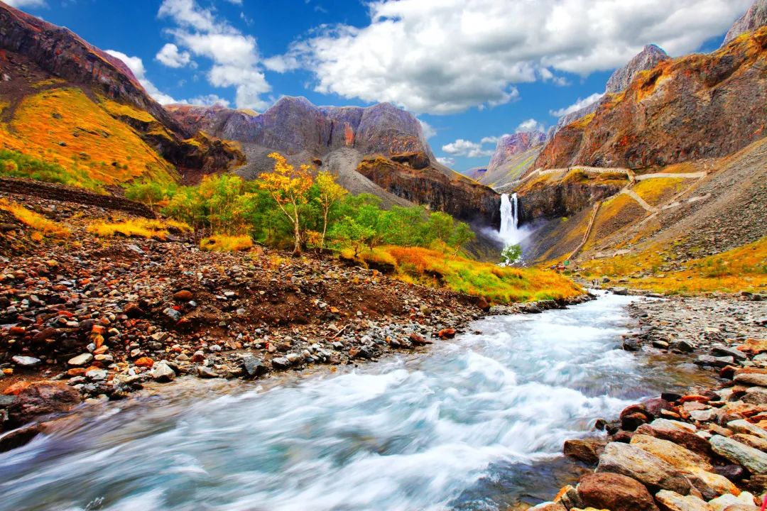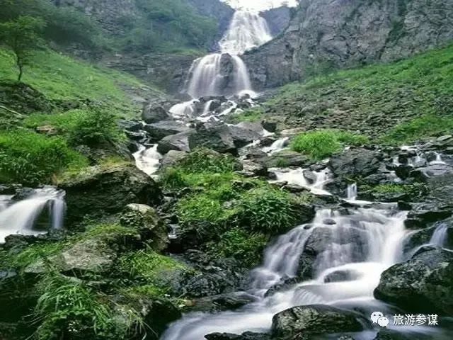 锦江瀑布也叫梯子河瀑布,总落差约70米。瀑布两侧的峭壁上奇松怪石多,瀑布下是高低起伏的高原大草甸。
