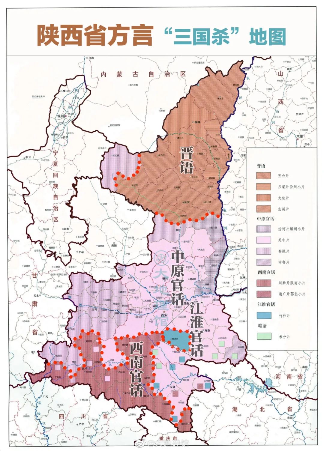 从方言来看——几乎一分为三。关中方言,属中原官话关中片,它和普通话比较,发音咬字重、声短促、调低沉;