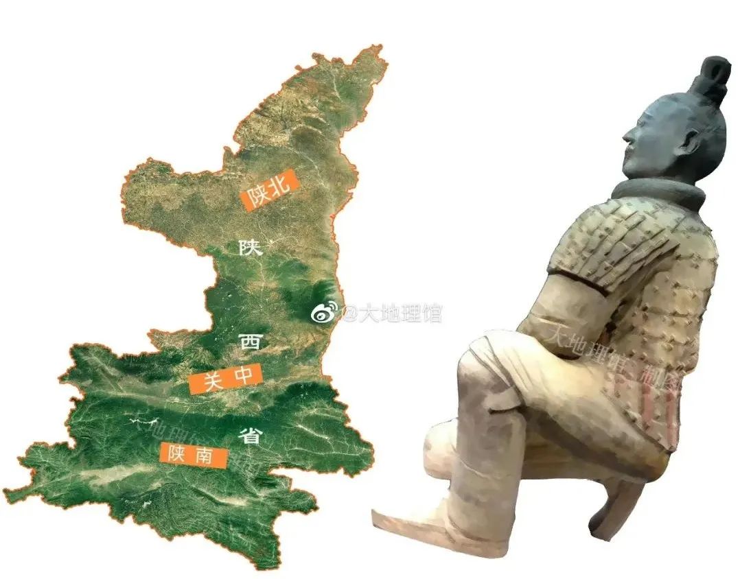 从地图看,陕西地图的轮廓,宛如一个跪着的兵马俑。头部、肩膀、胸部,以及拱手,组成了“陕北”;腰部是关中;腹部和卧蹲的双腿,组成了“陕南”。