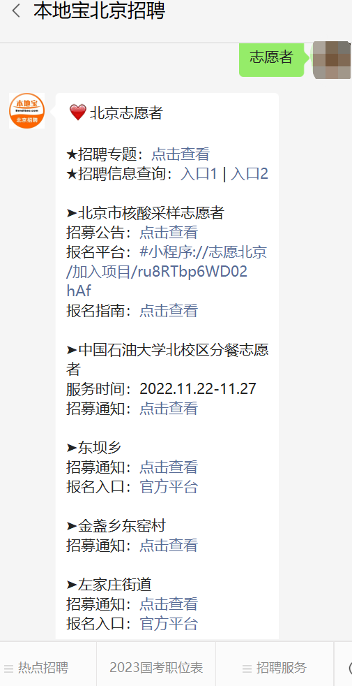 温馨提示:微信搜索公众号【本地宝北京招聘】,关注后在对话框回复【志愿者】可获北京核酸采样志愿者/防疫志愿者报名入口、各区街道社区招募通知(持续更新)。