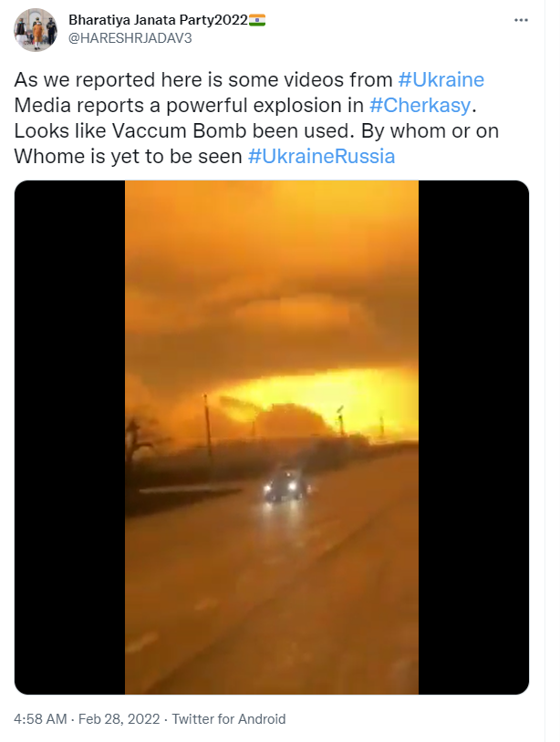 2022年3月, 中外社交平台上广泛流传一段视频,一位司机在车中亲眼目睹了一场剧烈的爆炸,现场火光冲天,黑夜如同白昼。