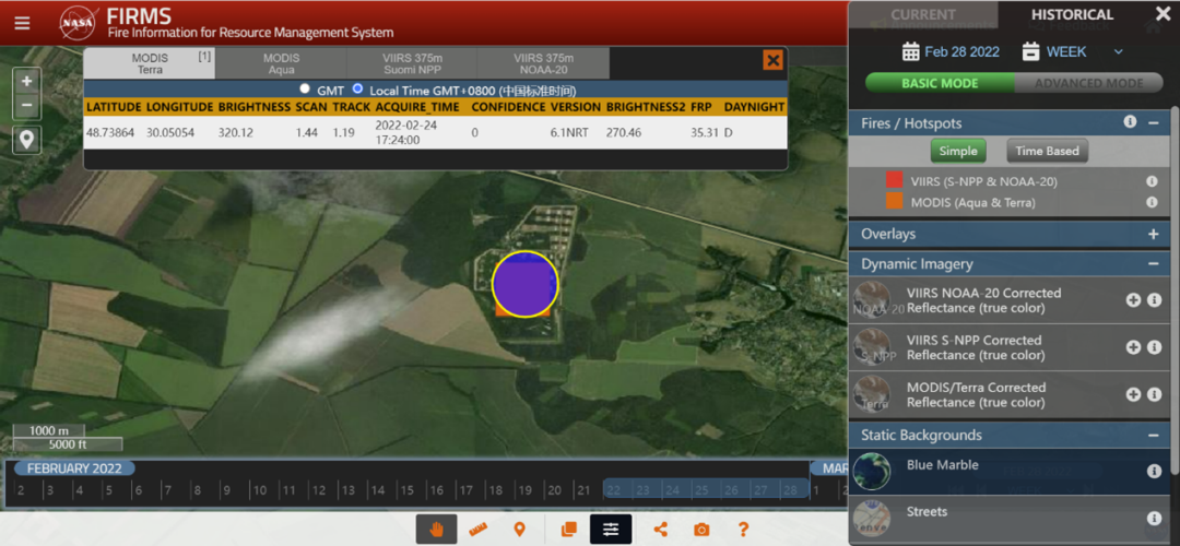 而利用NASA的热异常卫星图像,将时间锁定至2022年2月28日至之前一周,则最终可以确认,在当地时间2022年2月24日,也就是俄军进攻乌克兰的首日,位于切尔卡瑟州的“第222号中央炮兵武器库”附近发生过一次疑似爆炸的事件。