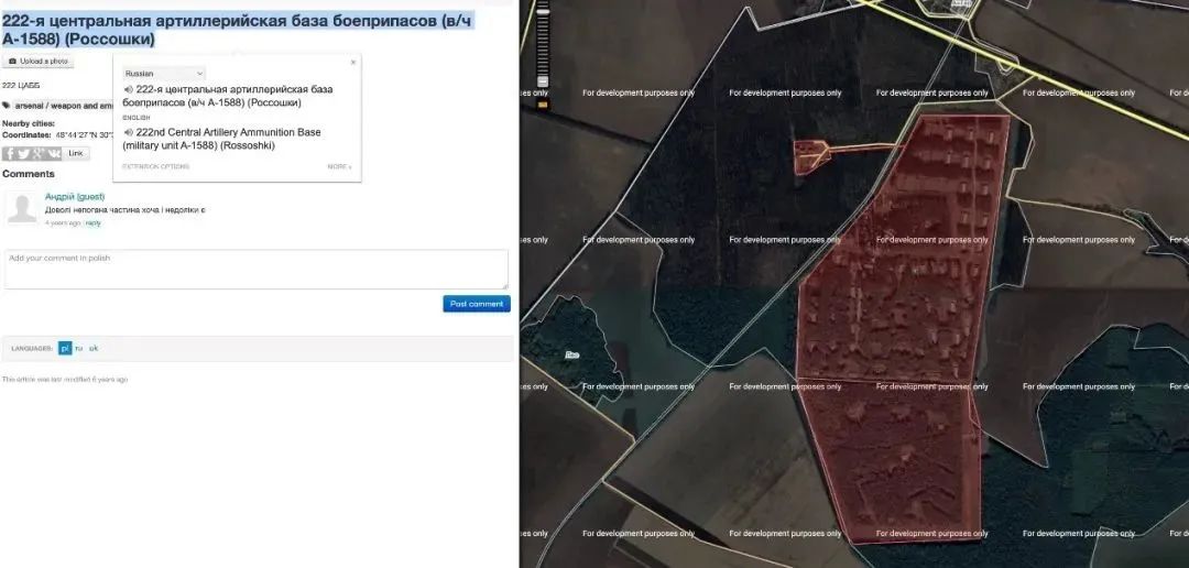 将此地理坐标与wikimapia上标记的6座位于乌克兰切尔卡瑟州的武器库位置进行比对,可以发现,视频摄制的地点与其中一家被命名为“第222号中央炮兵武器库”(222nd Central Artillery Ammunition Base)的位置十分接近。经比例尺测算,二者的直线距离约有3.63公里。