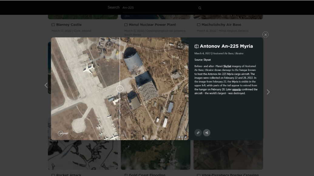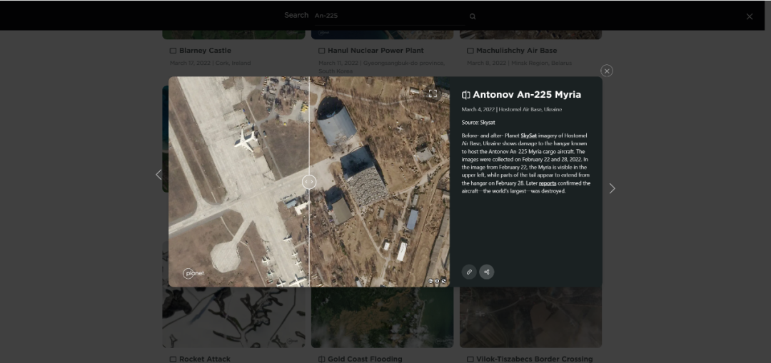 争夺战中,霍斯托梅尔机场几度易手,战况激烈。社交平台上有传言称,停放在霍斯托梅尔安东诺夫机场的世界最大飞机安-225“梦想”运输机已经被摧毁。为了验证这一说法,与“梦想”运输机相关的图像资料成为必需。但在那个寒冷冬日的紧张局势下,想要通过肉眼或摄像机来确认这架飞机的状况几乎是不可能的。而常用的街景图像也由于定期更新,无法提供实时的图像。