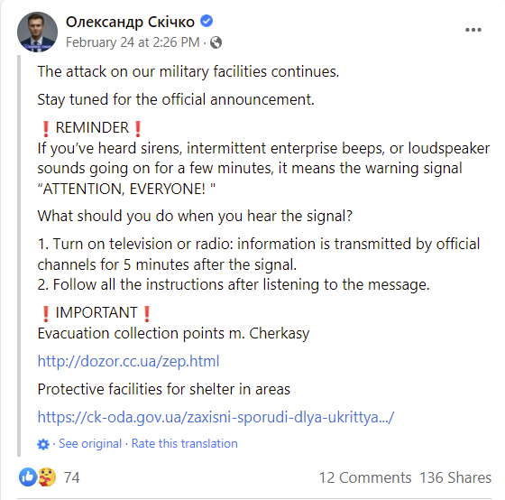 乌克兰国会议员Oleksandr Skichko在2022年2月24日发布警告信息,提请民众注意切尔卡瑟当地军事设施正遭受打击。