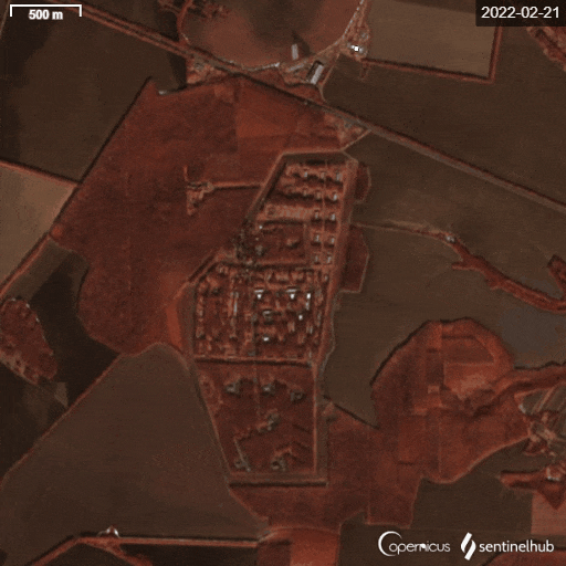 我们可以使用卫星图像软件EO Browser中的"延时”功能,将2022年2月21日至2月26日的卫星图像制作成动图,如此可以更清晰地观察到“第222号中央炮兵武器库”的地标在此期间发生的变化。