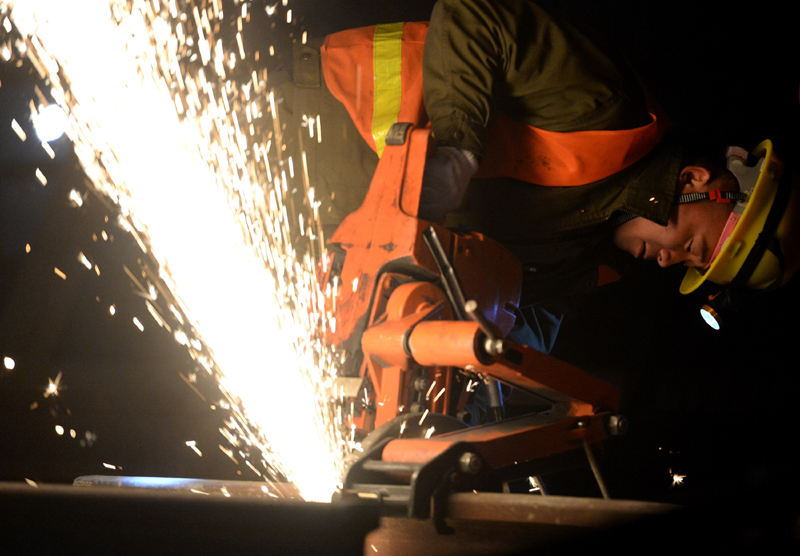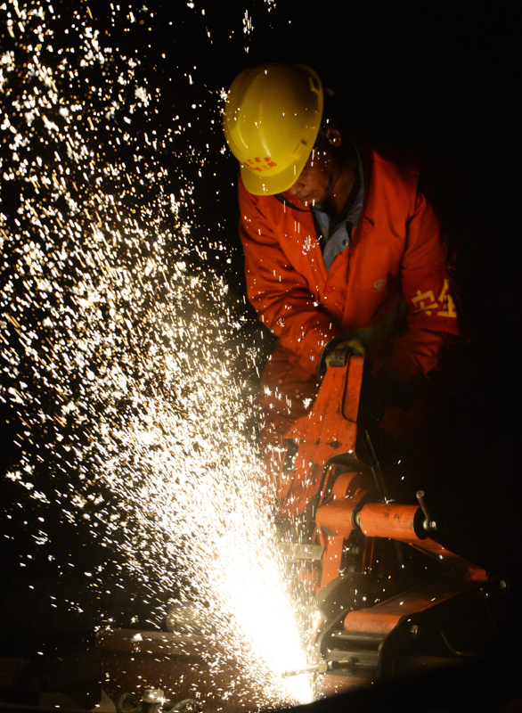 4月6日,施工人员在宝兰高铁宝鸡南站进行钢轨切割作业。
