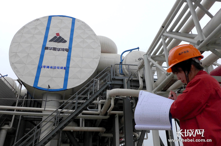 技术人员在河北国华沧东发电有限公司国产2.5万吨大型海水淡化装置前记录设备运行情况。傅新春 摄