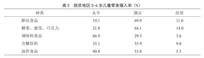 调查显示,脱贫地区家长通常会将“给孩子吃零食”作为爱孩子的方式,因此,儿童吃零食现象十分普遍,高达97.65%的孩子日常会食用零食。从调查结果来看,膨化食品最受儿童欢迎,有81.9%的孩子会吃膨化食品。食用糖果类零食的儿童有78.2%,喝含糖饮料、吃油炸食品的儿童的比例分别为64.9%和59.2%,都超过了一半以上。摄入最少的为“五毛零食”等调味料食品,但比例也达到了三分之一左右(见表5)。