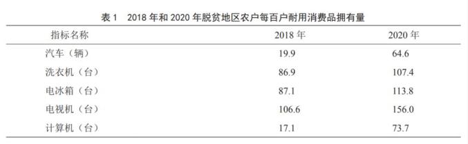 除此之外,脱贫地区传统耐用消费品拥有量也持续增加。调查发现,2020年脱贫地区每百户拥有的汽车、洗衣机、电冰箱、彩色电视机以及计算机的数量与2018年相比分别增加44.7辆、20.5台、26.7台、49.4台和56.6台(见表1),现代生活的耐用消费品快速增长。