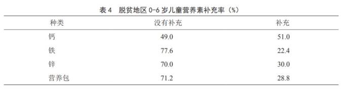 0-6岁儿童营养素补充意识也比较缺乏。脱贫地区0-6岁的儿童补充钙最多,比例为751.0%。补充铁和锌的孩子较少,不足三成。吃过营养包的孩子仅占28.8%(见表4)。在孩子超过两岁、国家不提供营养包后,家长就较少再给孩子补充营养素了。