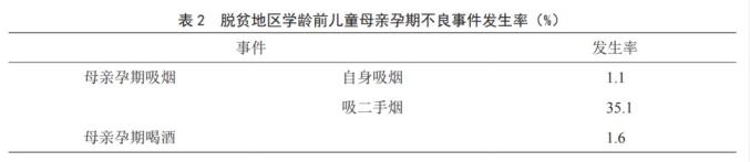 调查发现,脱贫地区孕妇孕期检查意识较强,孕妇怀孕期间参加产检的人数比例达到了89.7%。多数孕妇具有补充叶酸的孕期保健意识,孕期吃过叶酸的人数比例为75.5%,但是与《国民营养计划(2017-2030年)》中“到2020年将孕妇叶酸缺乏率控制在5%以下”的目标相比,还存在差距。值得注意的是,孕妇在孕期的不良事件时有发生(见表2),尤其孕妇吸二手烟的问题较为突出,数据显示35.1%的孕妇孕期经常吸二手烟。
