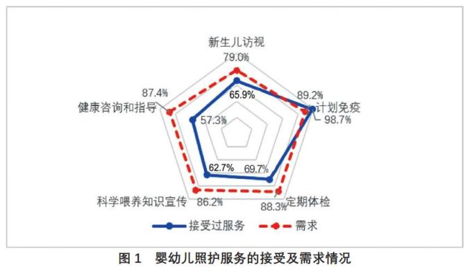 婴幼儿照护在家庭需求和服务供给方面存在差异。现阶段,为脱贫地区的家庭提供婴幼儿照护服务的多为与卫生保健相关的机构,教育和发展属性的机构偏少,仅6.7%的家长接受过早教家访员或活动中心志愿者的婴幼儿照护服务,仅11.8%的家长接受过早教机构或幼儿园的婴幼儿照护服务。调查显示,目前脱贫地区为婴幼儿照护提供的服务其实并不能完全满足家庭的需求(见图1)。有87.4%的家长认为需要被提供健康咨询和指导的服务,但实际上接受过此服务的仅有57.3%;有79.0%的家长需要新生儿的访视服务,但接受过新生儿访视服务的也只有65.9%;有88.3%的家长需要定期体检服务,但享受过定期体检服务的家长只有69.7%;有86.2%的家长需要科学喂养知识宣传的服务,但这一项服务的接受人数也仅有62.7%,离家庭的需求还存在一定差距。