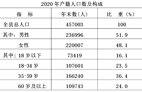 年末全县共有9个镇,101个行政村,15个社区居委会。共有户籍人口457003人, 其中:男性236996人,占51.9%;女性220007人,占48.1%,男女性别比为107.72。全年出生人口3291人,出生率为6.85‰;死亡人口2481人,死亡率为5.17‰;人口自然增长率为1.68‰。0-17岁抚养系数为26.8%,比上年上升0.2个百分点。表三