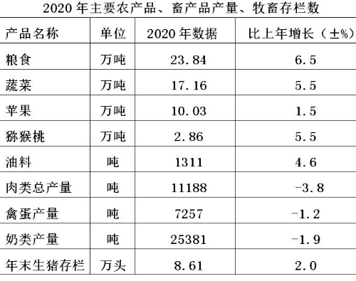 全年共播种农作物73.56万亩,较上年增长0.3%。其中:夏粮面积46.85万亩,秋粮面积14.13万亩,油料面积1.03万亩。全年粮食总产量23.84万吨,同比增长6.5%。其中:夏粮总产18.31万吨,秋粮总产5.53万吨。油料产量1311吨,同比增长4.6%。