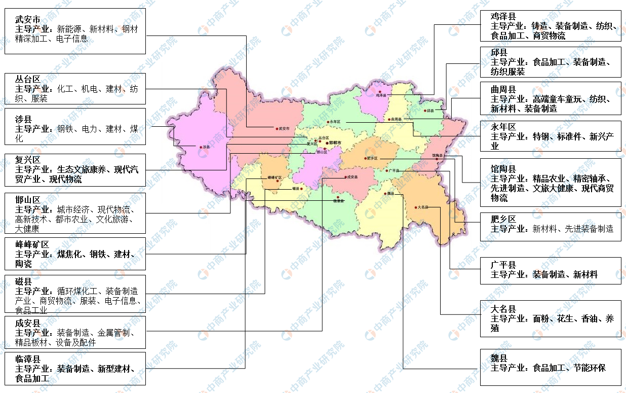 邯郸市下辖6区(邯山区、丛台区、复兴区、峰峰矿区、肥乡区、永年区)、1县级市(武安市)、11县(临漳县、成安县、大名县、涉县、磁县、邱县、鸡泽县、广平县、馆陶县、魏县、曲周县)、2个经济开发区(邯郸经济技术开发区、邯郸冀南新区)。各区域主导产业如下图所示: