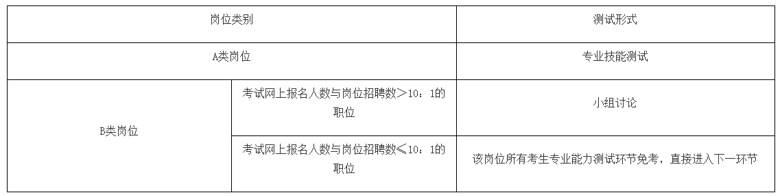 (3)形式:专业能力测试主要采取专业技能测试、小组讨论等形式,对考生进行考核。各岗位具体考核形式见下表。