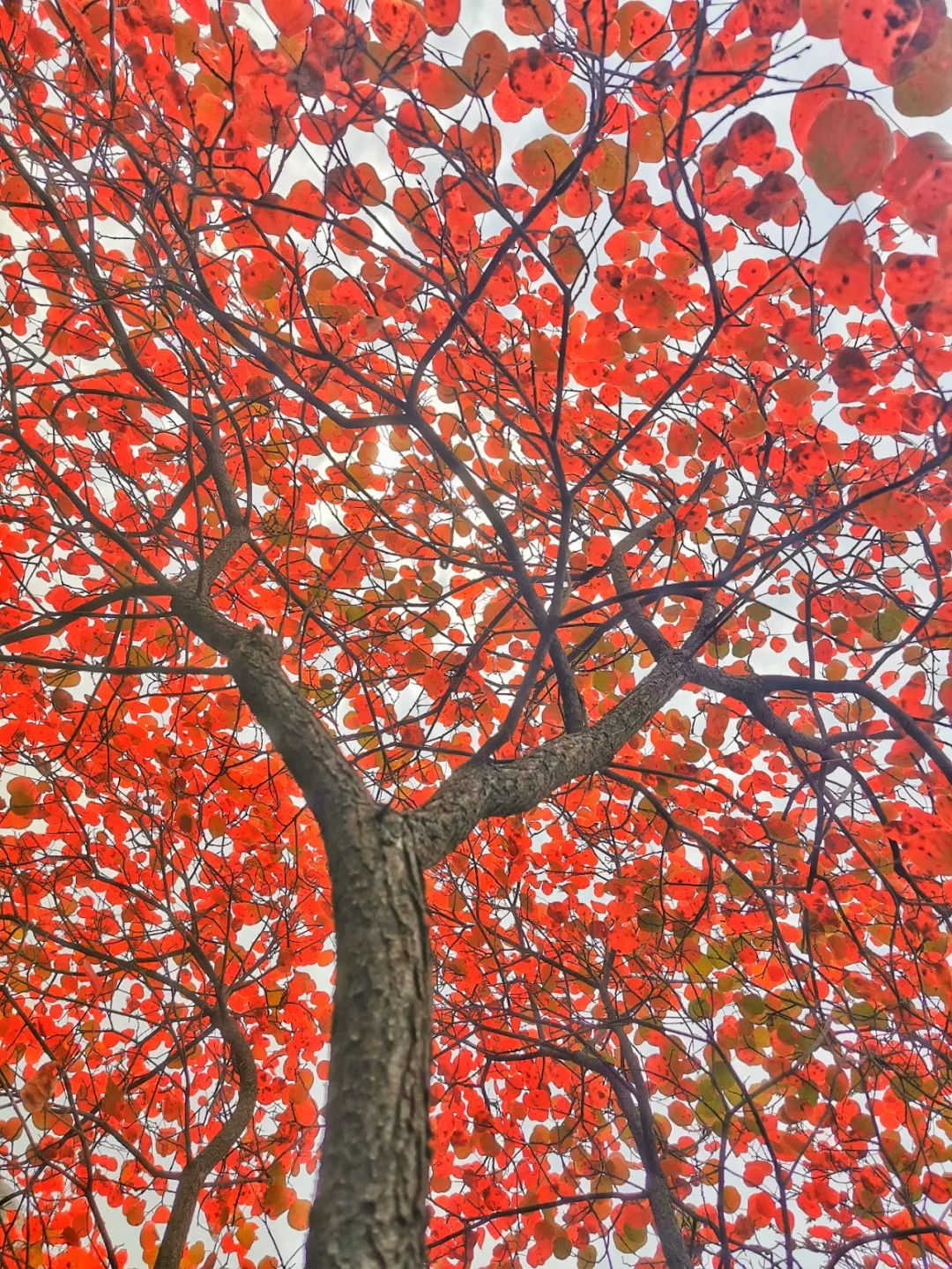 到了深秋,日均气温降低,昼夜温差拉大,光照逐渐减少,这都有利于花青素的形成。此时红叶树种叶片细胞液便呈现酸性,叶片于是就出现了红色的效果。