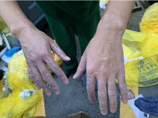白天烈日当头下的工作和上门采集工作是最辛苦的。摘下口罩,口罩里可以倒出水。反复湿透反复晒干的衣服,可以清晰看到盐渍的纹路。大家会比谁的盐渍纹路更艺术更漂亮,仿佛那是披在身上的铠甲。