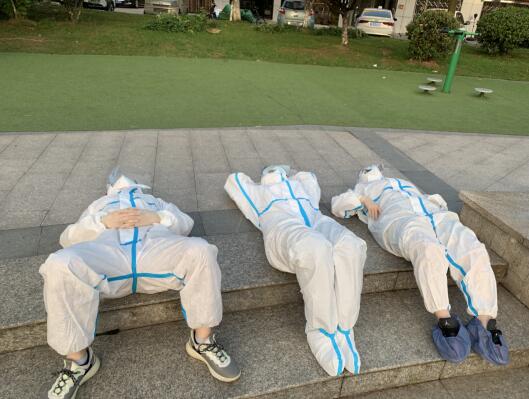 00:30,我们正式开始工作,直到05:30,支援我们的队伍到来,才得以休息。大家都躺在地上不愿起来,有的队员连脱掉防护服的力气都没有。从繁星点点,到雄鸡报晓,这一夜十分漫长。