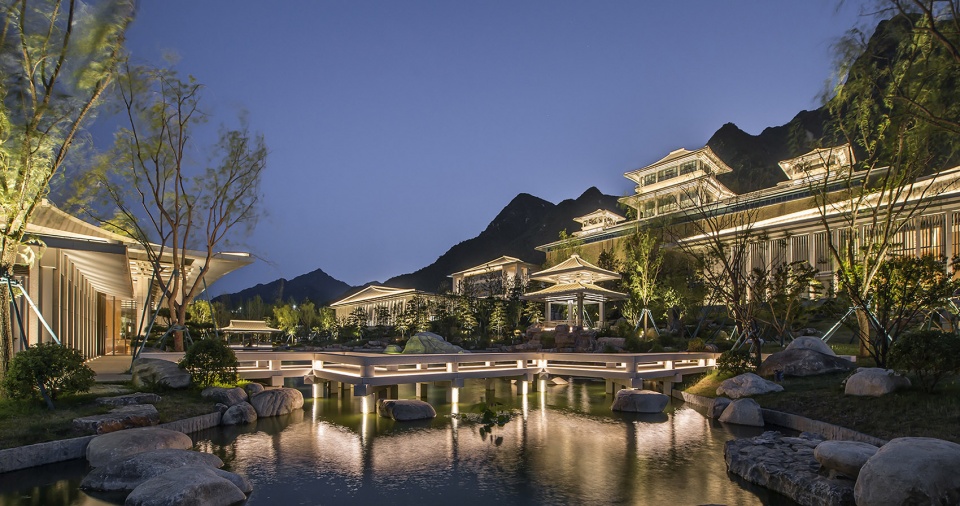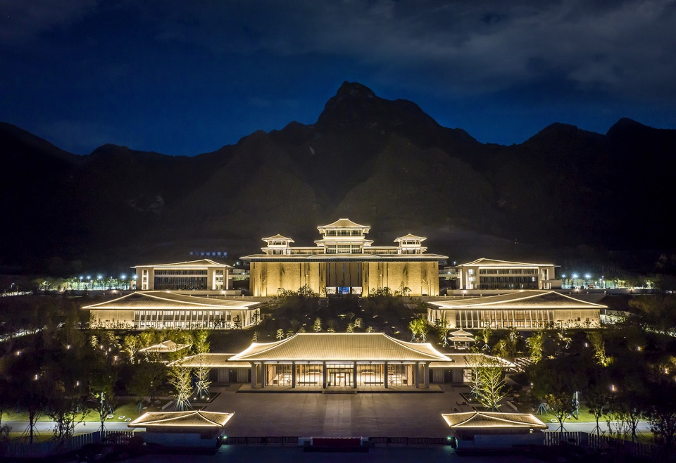 The project covers an area of about 300 mu, with a total floor area of 825,00 square meters. The overall layout takes full advantage of the towering and dangerous Guifeng mountain as the background. The axis of the project is led northward from the highest point of Guifeng, facing the open and flat Weichuan. The northwest has the Fengjing Ruins of the Zhou Dynasty, and the northeast has the Caotang temple built in the Eastern Jin Dynasty. The overall layout strives to be square, atmospheric and elegant, while adopting the community spatial layout of the Royal landscape gardens. On the highland of the southern section of the axis, pavilions are built on the high platforms. Buildings bring functional areas distribute on both sides are staggered one by one according to the changes of terrain. Finally, the buidings forms a structure of central axis symmetry and master-slave order, while corresponds to the harmony of the mountains. It also creates a poetic and picturesque atmosphere of clouds traversing the Qinling Mountains and Weichuan River in the north.