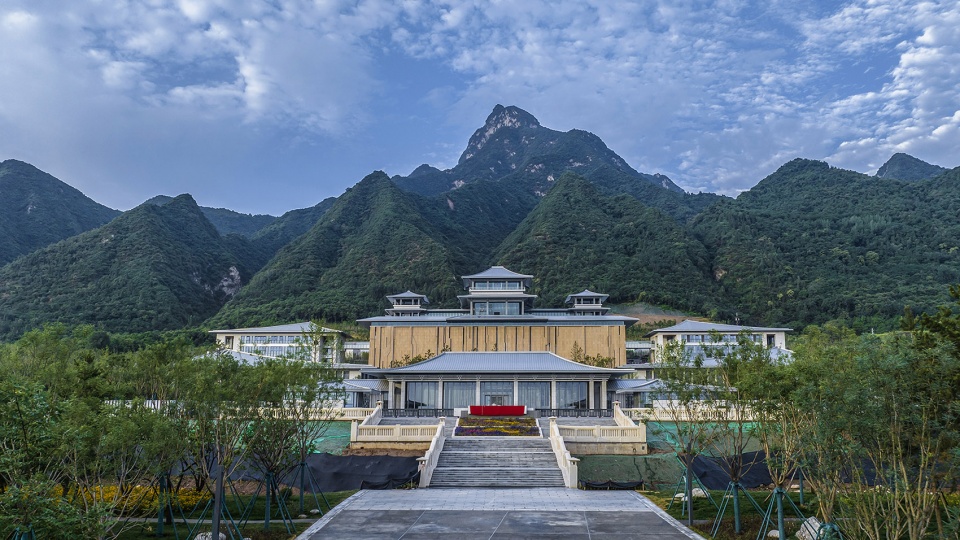 项目占地约300亩,总建筑面积8.25万平方米。总体布局充分利用山形高耸险竣的圭峰为背景。从圭峰至高点向北引出项目的轴线,面向开阔平坦的渭川,西北正对周代丰京遗址,东北有始建于东晋的草堂古寺。总体格局力求方正、大气、典雅,采用皇家山水园林的群落空间布局。轴线南段高地上高台筑阁,两侧依地形变化逐台错落,分置各功能区。形成中轴对称、主从有序之势,与层层山峦唱和相应。营造云横秦岭、北望渭川的诗情画意。