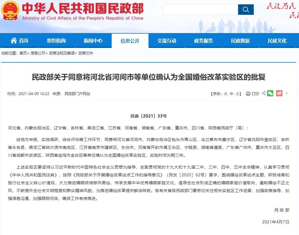 【全国婚俗改革实验区出炉 宝鸡市金台区在列】4月9日,民政部网站发布《民政部关于同意将河北省河间市等单位确认为全国婚俗改革实验区的批复》,经地方申报、实地调研、综合评估等工作环节,同意陕西省宝鸡市金台区等单位确认为全国婚俗改革实验区,实验时间为期三年。