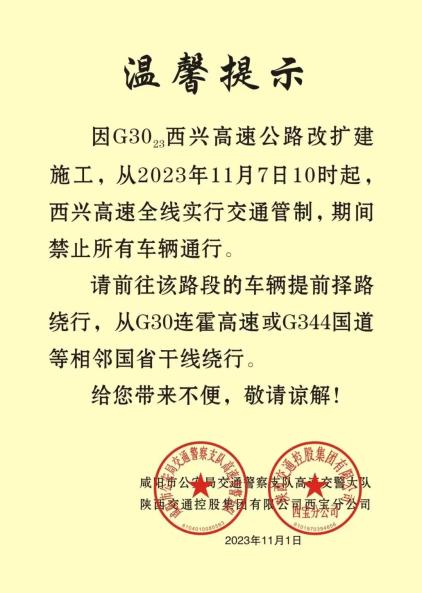 原标题:《咸阳、咸阳西、三桥收费站即将封闭!西兴高速11月7日起进行交通管制》