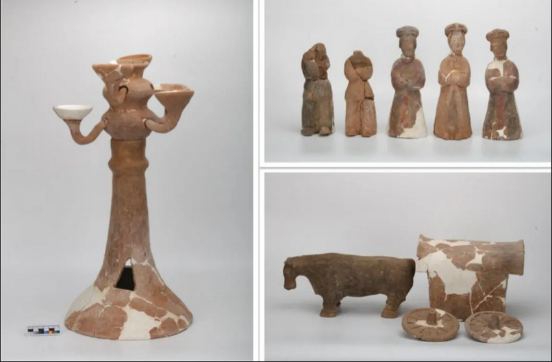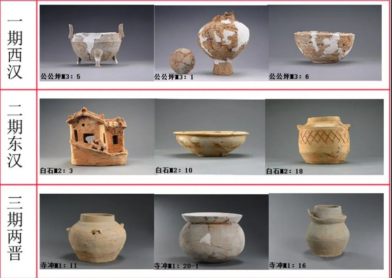 十六国墓葬位于墓地东北部,共38座,呈四列分布,墓葬形制均为长斜坡墓道洞室墓,墓道均有二或三级台阶。出土陶人物俑、陶骑马俑、陶牛车、陶九盘连枝灯、陶灶等器物。柴怡说,“其中,M452墓室内发现土雕仿木建筑造型,为十六国墓葬中所罕见。”